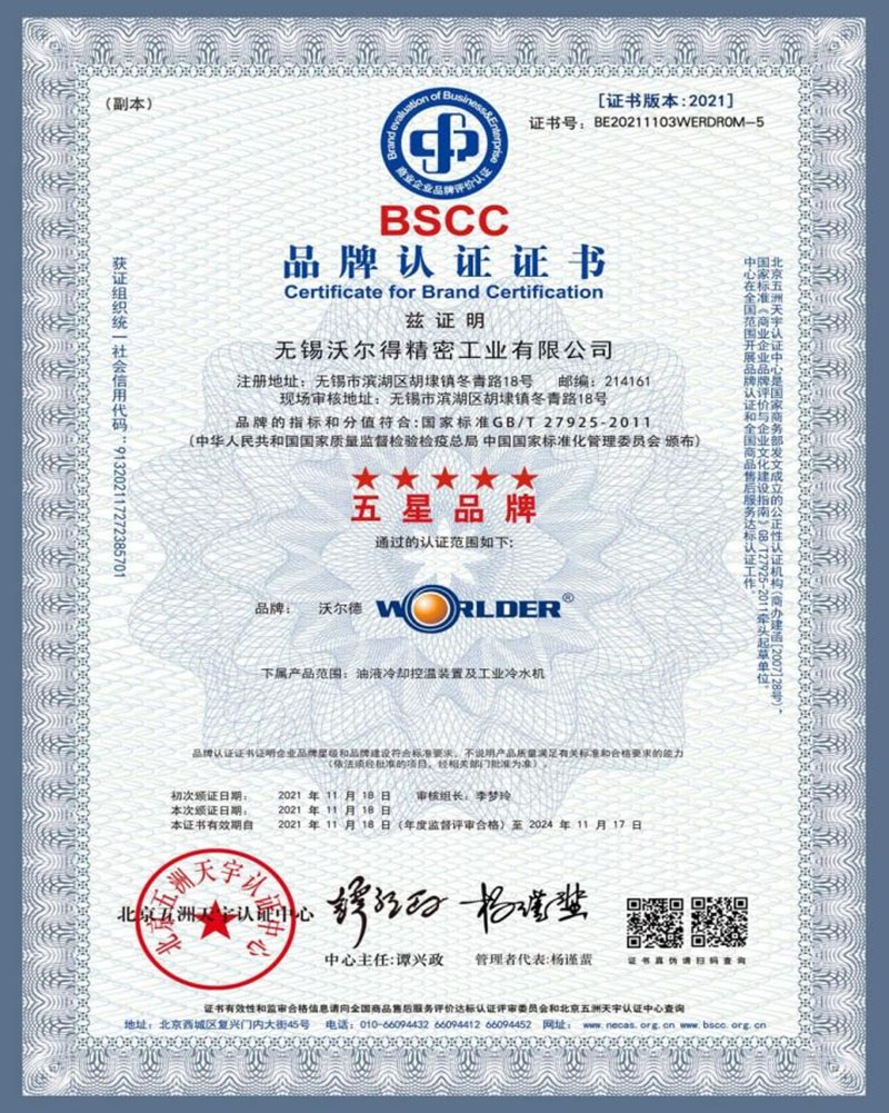 2021年11月公司通過了中國標(biāo)準(zhǔn)化管理委員會頒布的“標(biāo)準(zhǔn)GB/T27925-2011”品牌認(rèn)證,榮獲“五星品牌”。